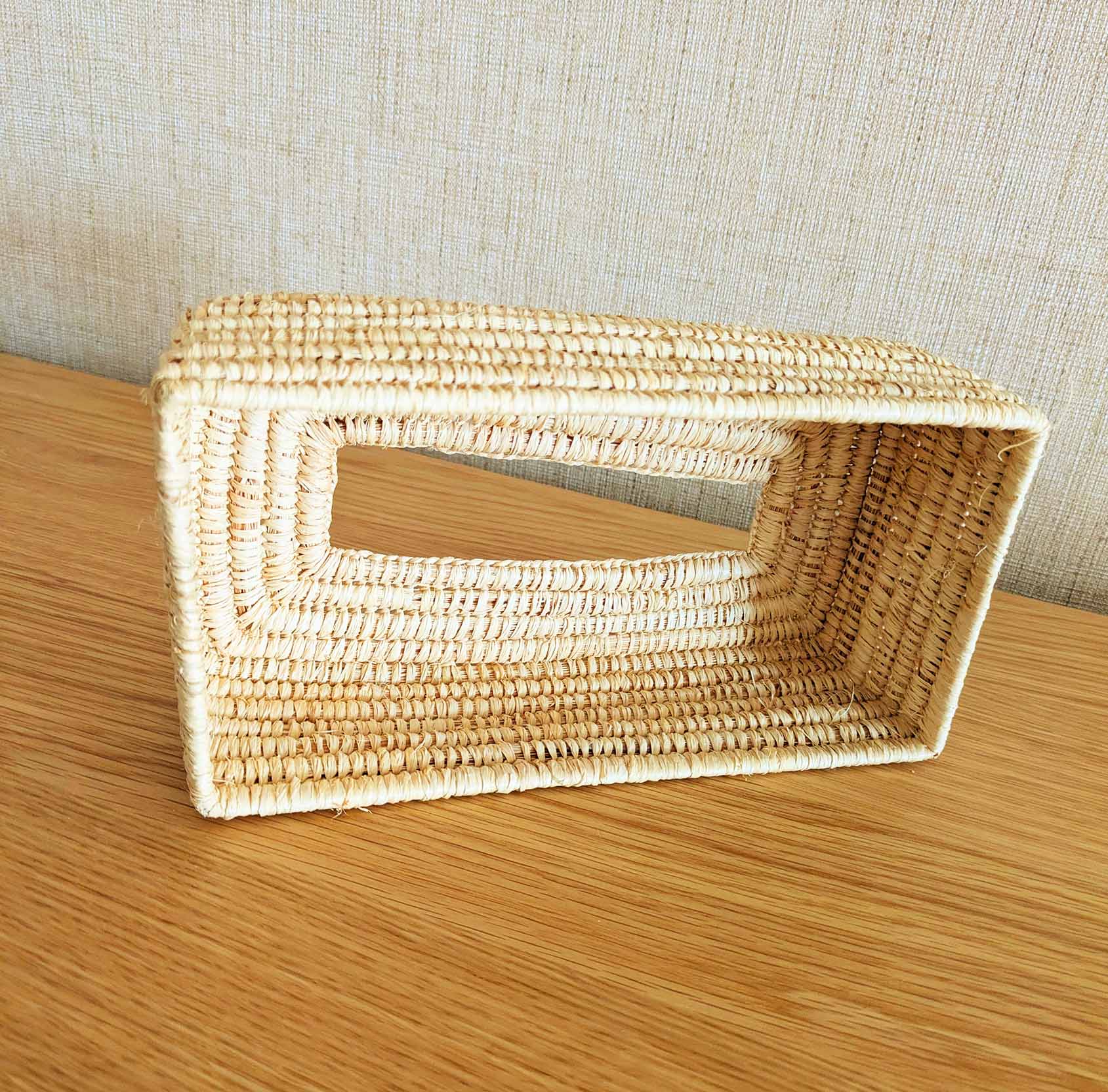Découvrez cette magnifique boîte à mouchoirs rectangulaire entièrement tressée à la main en fibres de palmier naturel. Son tressage serré en spirale révèle la maîtrise exceptionnelle des artisans qui transforment la fibre végétale brute en un accessoire décoratif raffiné. Chaque rangée est minutieusement entrelacée pour créer une structure solide, régulière et harmonieuse.