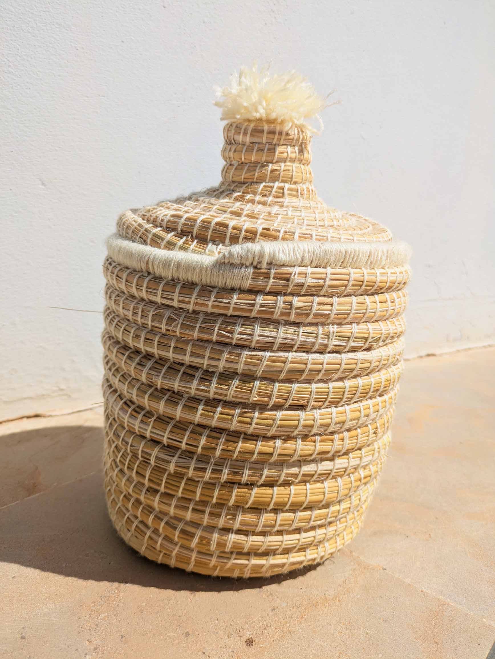 Ce panier authentique allie la finesse du tressage artisanal de palmier naturel au charme bohème de son pompon blanc généreux. Chaque pièce est unique et témoigne d’un savoir-faire traditionnel berbère transmis de génération en génération.